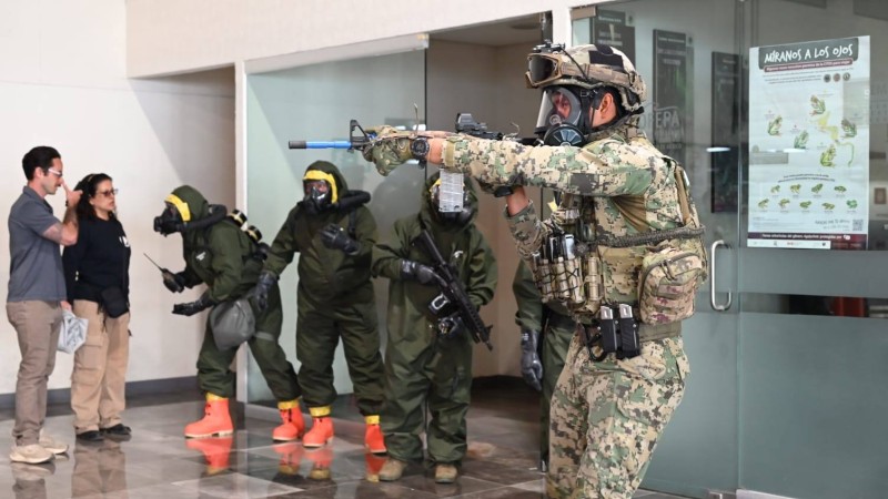 La Secretaría de Marina, a través de la Armada de México, informa que hoy, personal de la Unidad de Protección Aeroportuaria (UNAPAP), de la “Fuerza de Tarea de la Copa Mundial de Futbol 2026”, la Unidad de Operaciones Especiales (UNOPES), en coordinación con autoridades aeroportuarias y dependencias competentes, participó en un ejercicio de gabinete/operativo orientado a fortalecer los protocolos de reacción ante un escenario simulado que involucró la presunta localización de un objeto sospechoso con posible riesgo radiológico (QBRN) en instalaciones del Aeropuerto Internacional de Toluca (AIT).