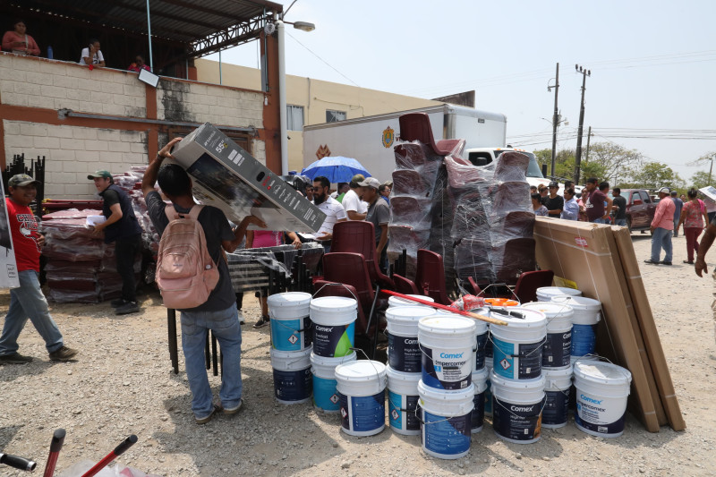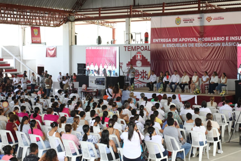 Durante la entrega de mobiliario y equipo en el municipio de Tempoal, la dependencia distribuyó insumos en 145 escuelas: más de 3 mil piezas, entre sillas, mesas, pupitres, gabinetes y proyectores, mil 276 cubetas de impermeabilizante, material para pisos y baños, así como 5 mil 300 kits de mochilas con útiles escolares.