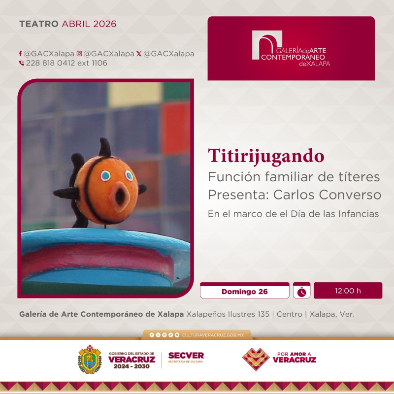 Xalapa, Ver., sábado 25 de abril de 2026.- En el marco de las celebraciones por el Día de las Infancias, la Secretaría de Cultura de Veracruz invita a la presentación de la obra teatral Titirijugando, del maestro Carlos Converso. La función se llevará a cabo el domingo 26 de abril a las 12:00 horas en la Galería de Arte Contemporáneo de Xalapa. La entrada es gratuita.