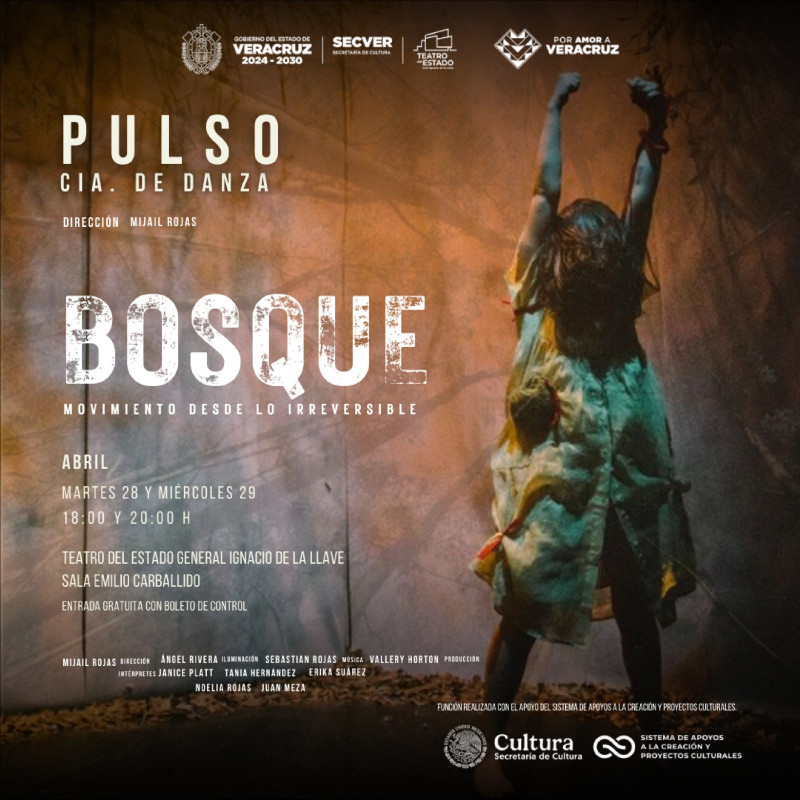 La Secretaría de Cultura de Veracruz invita a disfrutar de las funciones de Bosque, Movimiento desde lo irreversible, bajo la dirección de Mijail Rojas, que se realizarán los días 28 y 29 de abril, en el Teatro del Estado General Ignacio de la Llave, en el marco del Día Internacional de la Danza. El acceso es gratuito con boleto de control.