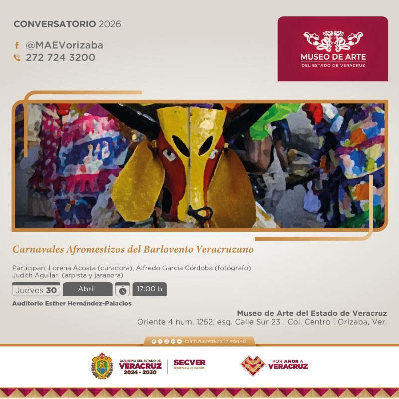 La Secretaría de Cultura de Veracruz invita a conocer la exposición Carnavales afromestizos del Barlovento veracruzano, del 30 de abril al 30 de agosto en la Sala Permanente de Arte Popular del Museo de Arte del Estado de Veracruz (MAEV), en Orizaba, de martes a domingo, en horario de 9:30 a 18:00 horas. La entrada es gratuita.