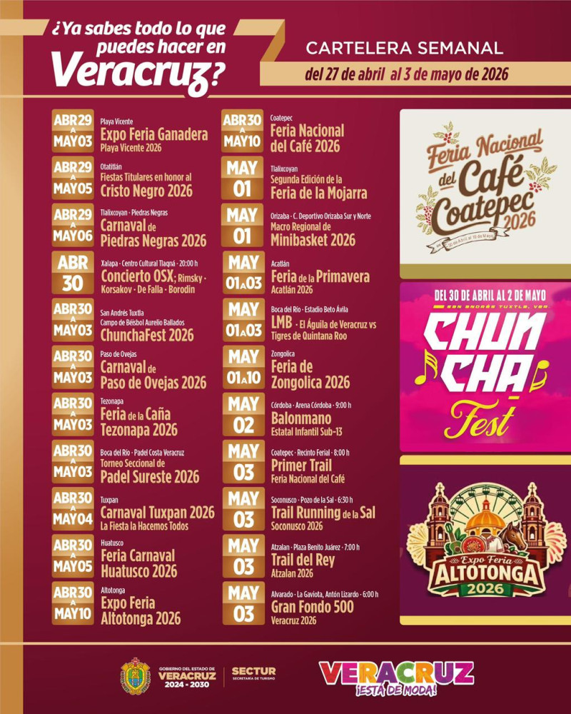 Del 01 al 03 de mayo, en Acatlán, la realización de la Feria de la Primavera; en Boca del Río, el Águila de Veracruz enfrentará a los Tigres de Quintana Roo; y del 01 al 10 de mayo, en Zongolica, tendrá lugar la Feria de Zongolica 2026.