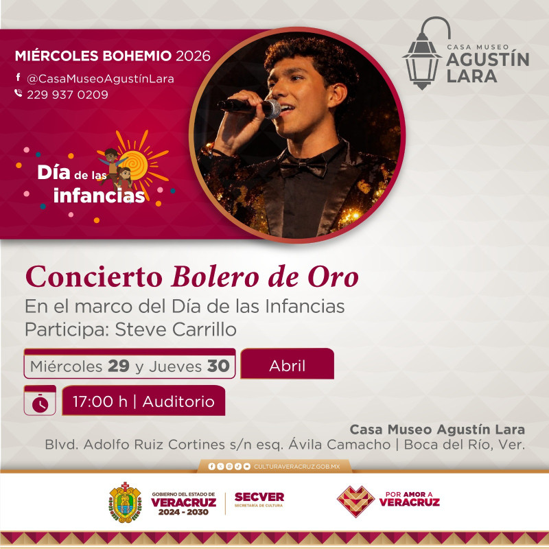 La Secretaría de Cultura de Veracruz (SECVER) invita al concierto Bolero de Oro, que se realizará los días 29 y 30 de abril, a las 17:00 horas, en el auditorio de la Casa Museo Agustín Lara, en Boca del Río, en el marco del Día de las Infancias. La entrada es gratuita.